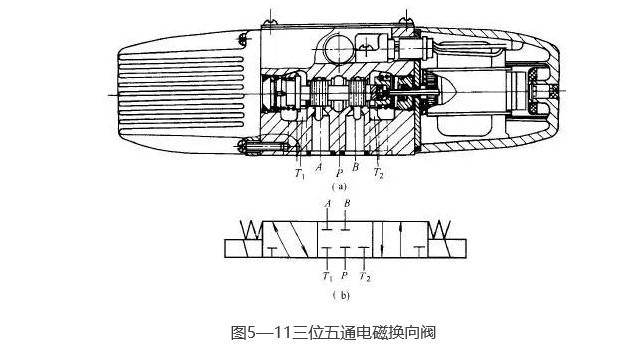 圖5-11所示為35D-25B型三位五通板式交流電磁換向閥的結(jié)構(gòu)和圖形符號(hào)圖。當(dāng)左、右電磁鐵均斷電時(shí),其閥芯在兩端彈簧的作用下處于中位(圖示位置);當(dāng)左電磁鐵通電時(shí),即推動(dòng)推桿將閥芯頂向右端;當(dāng)右電磁鐵通電時(shí),即推動(dòng)推桿將閥芯頂向左端,從而實(shí)現(xiàn)了油路的換向。