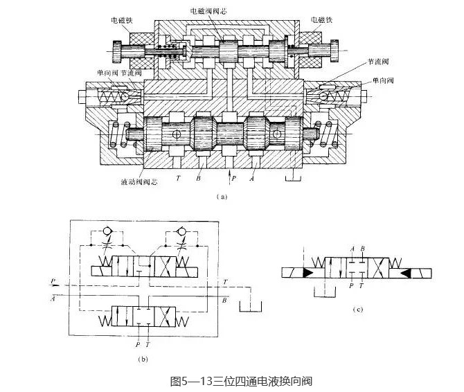 圖5-13所示為電液換向閥的結(jié)構(gòu)圖和圖形符號(hào)圖。當(dāng)電磁閥左端電磁鐵通電時(shí),電磁閥閥芯被推向右端(左位接通),控制壓力油通過(guò)電磁閥流入液動(dòng)閥閥芯的左端,推動(dòng)液動(dòng)閥閥芯向右移動(dòng),其右端的油液經(jīng)電磁閥回油箱,此時(shí)主油路P口與A口接通,B口與T口接通。反之,電磁閥右端電磁鐵通電時(shí),控制壓力油經(jīng)電磁閥進(jìn)入液動(dòng)閥閥芯的右端,推動(dòng)液動(dòng)閥閥芯向左移動(dòng),其左端油液經(jīng)電磁閥回油箱,使主油路P口與B口接通,A口與T口接通。如電磁閥左、右電磁鐵均斷電,則電磁閥閥芯處于中位,控制壓力油被阻斷,不能進(jìn)入液動(dòng)閥,且因電磁閥的中位機(jī)能為Y型特性,使液動(dòng)閥兩端的油液均經(jīng)電磁閥中位泄回油箱,因此液動(dòng)閥也在其兩端彈簧的作用下處于中位,主油路P、T、A、B口均不相通。